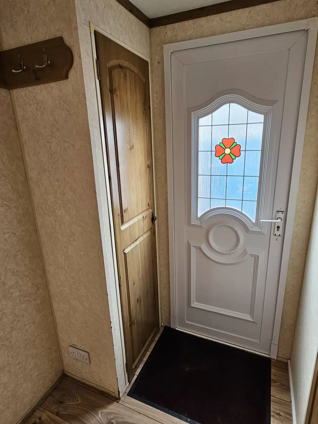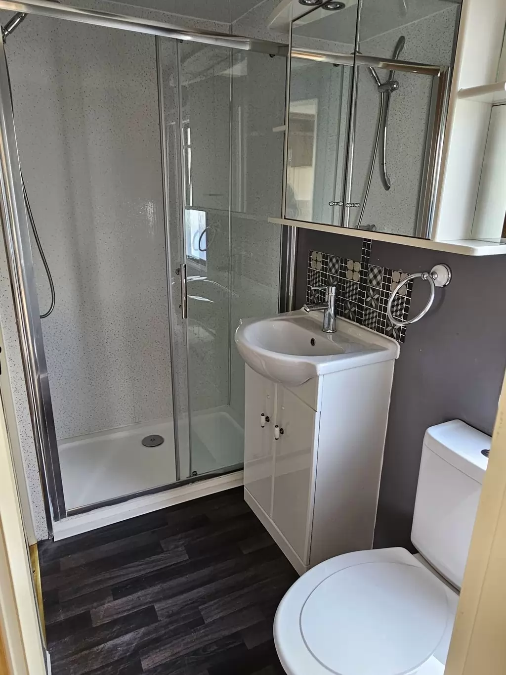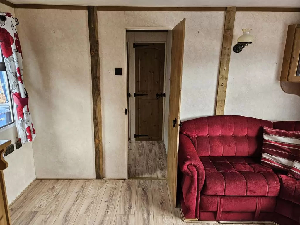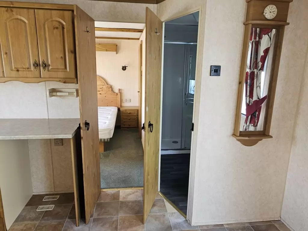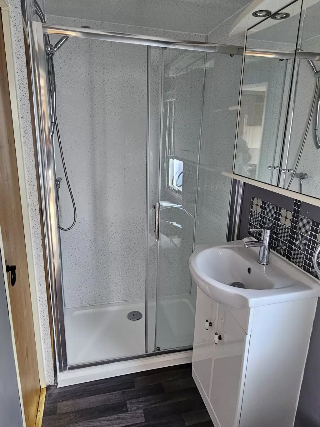 Extra wide, BEAUTIFUL, equipped mobile home 11.3 x 3.7m with two entrances with bay windows, GABLE ROOF, DOUBLE (insulating) WINDOWS AND DOORS - dithermy. CENTRALLY (in the middle) - living room (sofa bed), space for dining area, U-shaped kitchen, ON THE RIGHT SIDE - spacious bedroom (double bed with storage space) + dressing room, bathroom with shower + toilet, ON THE LEFT SIDE - room (2 beds), toilet with sink. Electric fireplace + electric heaters, gas water heating. Raised ceiling throughout the mobile home!!